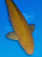 | Matt-scaled Matsuba are grouped in Kawarimono, but their metallic equivalents are benched Hikarimono. The most commonly available are Kin Matsuba (metallic gold/yellow, first produced in 1960) and the Gin Matsuba, its silver equivalent. Platinum (white) Matsuba and Aka Matsuba Ogon are not often seen. The pinecone scalation must be pronounced; if the black is more of a gray, these koi look washed out. Beginners are often confused by the Doitsu Matsuba Ogon, as the scale reticulation is not present. Instead, the black, German scales are aligned in the usual position, where they contrast sharply with the metallic body. Orange Doitsu Ogonare very rare. |