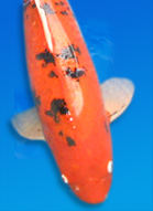 Aka Bekko, never to be referred to as Hi Bekko, are red koi with Bekko sumi markings. Ideally, the body of Aka Bekko should be a scarlet red hi, overlain with deep sumi and offset with pure white or clear finnage. The only koi likely to be confused with Aka Bekko are Aka Sanke; the singular difference being that Aka Sanke show white areas on the body when viewed from above. Aka Bekko are allowed some hi in the finnage, which tends to appear in blotches rather than stripes, although pure white pectoral fins are most pleasing.kin is visible when the koi is viewed from above, the koi is a Showa. Another one of our favorite koi fish. |