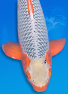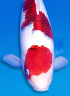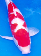 Kohaku are red and white koi with an even intensity of color. The main color should be snow white, with no yellowing and should exhibit a fine luster. Patterns are “stepped” and are recognized by consecutive islands of color. A classic Kohaku exhibits strong red coloring on it’s head, followed by a 3 or 4 “stepped” pattern. “Tancho” Kohakus exhibit 1 lone head marking followed by a distinct “stepped” pattern. Kohakus are a must for every koi fish pond. The most common of the Japanese koi. |