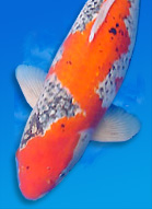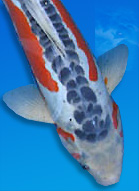 This is a white koi with the hi pattern similar to Kohaku, but each red scale is edged in black or dark blue, reminiscent of their Asagi ancestry. Good Ai Goromo are judged much like good Kohaku, with all the qualities expected of that variety: snow-white skin, deep crimson hi, and an interesting traditional or modern pattern. The dark lining along the scales appears only faintly when the koi is young and may take years to come out fully. Too much sumi early in life is an indication that this color will eventually overwhelm the koi. But in mature koi, the sumi should be evenly distributed over all patches of hi, with the exception of the head. |