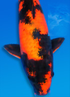 Hi Utsuri are best viewed as a Showa without the white. Until recent years, the hi was rarely scarlet, but out crossings with Kohaku have greatly improved upon this variety. Some breeders have also reintroduced Magoi genes into their strain of Hi Utsuri, which allows the koi to attain a greater size without any falloff in pattern or skin quality. the pectorals rarely s the edges should be clearly defined. Too much black on the head, makes for an inferior koi. |