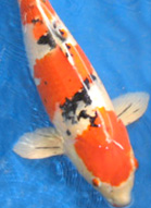 Once known as the Taisho Sanke, or Taisho Sanshuko, koi of the Sanke variety look very much like Kohaku that have been spattered with ink. As a matter of fact, the two varieties, Sanke and Kohaku, are closely linked and are the only koi varieties with traceable bloodlines. A Sanke looks like a Kohaku combined with a Bekko. The red color should be deep and even, and well balanced when viewed without the black sumi. On the other hand, the black sumi should also be well balanced when viewed separately and should not extend below the lateral line. All the markings should have distinct edges separating the colors and the skin, which should be a snowy white. A great addition to your pond! |