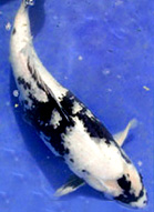 Like a Kohaku, Shiro Utsuri are classically simple, two-colored koi. It’s body should be the color of pure snow with a healthy, yet subtle sheen. A Shiro Utsuri is a black fish with white markings, a Shiro Bekko is the reverse, and all Utsuri sumi is of the typical Showa "wraparound" type.